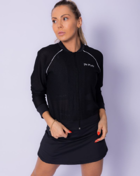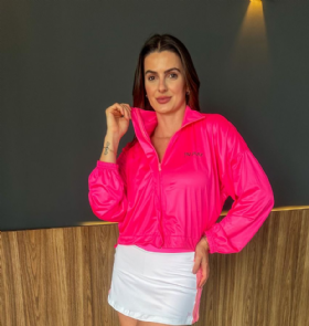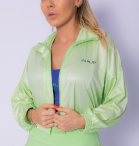 Bolsos embutidos nas laterais, gola mais alta para proteger em dias mais frios e as mangas levemente deslocadas, para dar mais liberdade de movimentos nas cavas. Comprimento normal em cima do quadril.